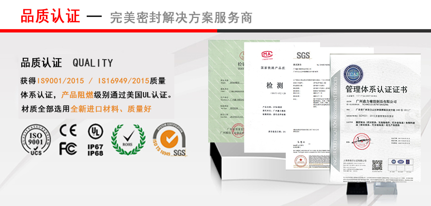 (3)廣州鑫力橡膠采用標準的生產(chǎn)管理及質(zhì)量管理體系,先后通過ISO9001、ISO14001、ISO/TS1694等各種認證。
